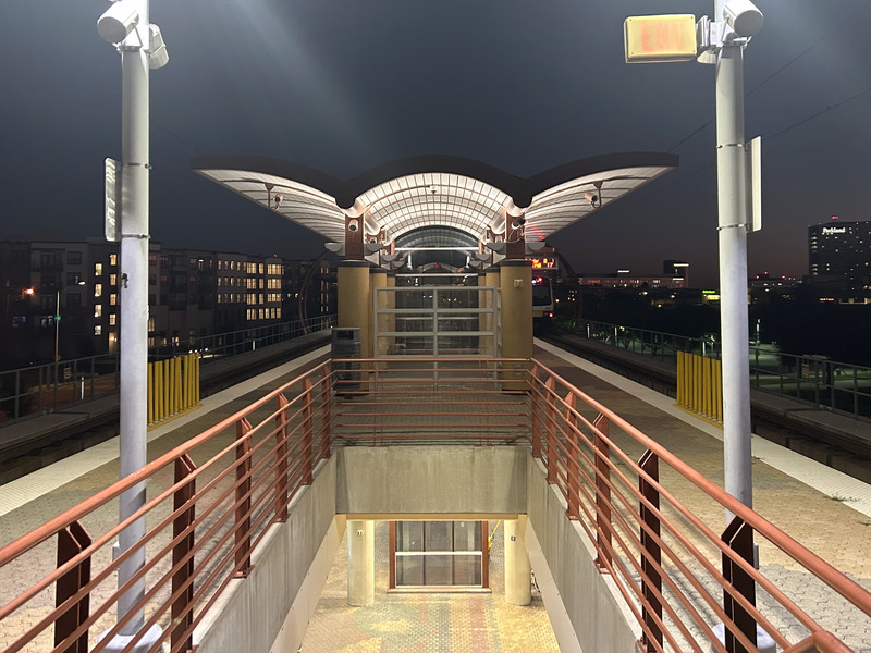 Coming from San Jose’s pitiful light rail, I’m consistently surprised by how solid DART’s infrastructure is. Nearly the whole Green Line is elevated, and trains can reach 65 mph on straightaways. DART’s Green Line stations also feature early-2000s architectural aesthetic we all know and love. The friendly swoops and creases add some whimsy to an otherwise boring station. On the other hand, the Silver Line stations are all sharp angles and bright lights. Certainly more modern, but certain features like the diffused glass / LED combo probably won’t age well.